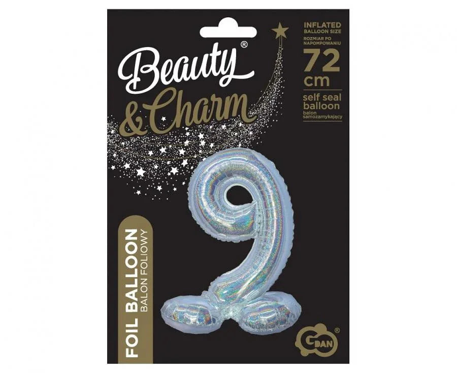 Ezüst Holographic Silver 9-es szám fólia lufi talppal 72 cm